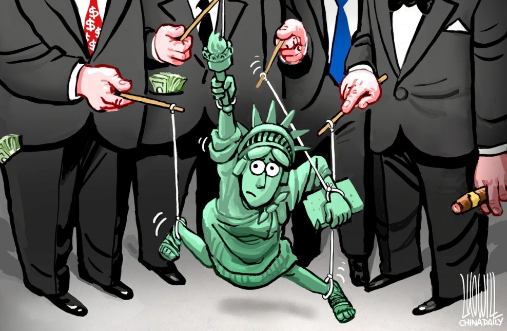 中國(guó)日?qǐng)?bào)系列漫畫(huà):十問(wèn)美國(guó)民主 真相觸目驚心