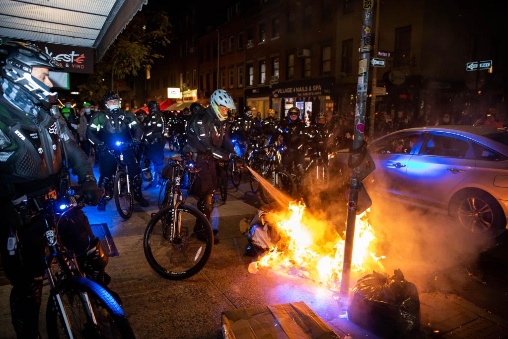 2020年11月4日,在美國紐約,警察撲滅抗議者點燃的垃圾。(新華社發,郭克攝)