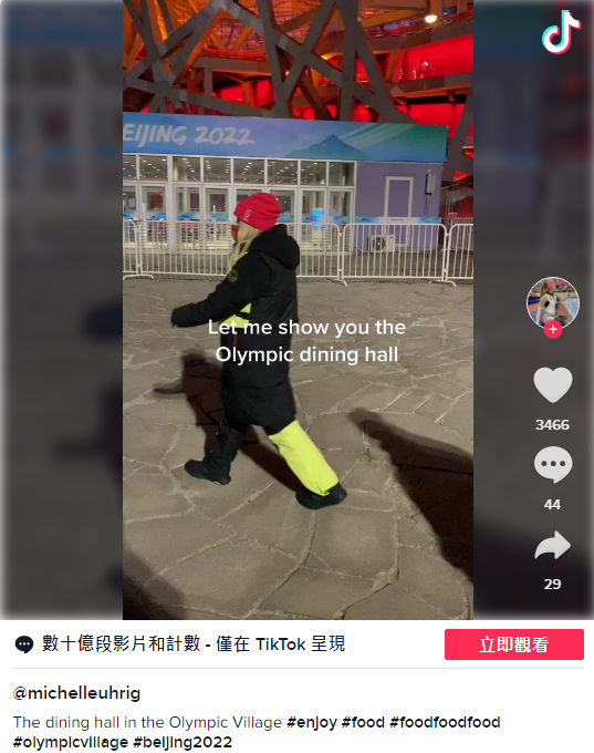 愛(ài)沙尼亞滑雪運(yùn)動(dòng)員凱莉·西爾達(dá)魯分享了一段關(guān)于如何在冬奧村安全進(jìn)餐的視頻。事實(shí)上,她所說(shuō)的安全與新冠疫情無(wú)關(guān),而是指不要吃得太多。