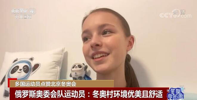 俄羅斯奧委會隊運動員 謝爾巴科娃:冬奧村很舒適,房間條件很好,每一個人都有冰墩墩抱枕,但其實它打開是一個毯子,這是一個小機關。這里的氛圍很好,我們經常去散步,這里環境優美舒適,我很喜歡。