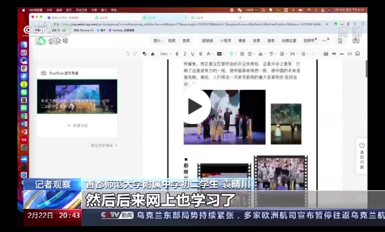 這份調查報告只是這幾個女生寒假作業中很小的一部分,事實上,學校給孩子們布置的探究類和實踐類作業可謂是五花八門。打開首師大附中初二4班的微信公眾號和視頻號,一陣歡暢的青春氣息迎面撲來。助力冬奧、運動、烹飪、閱讀、手工藝制作,眼花繚亂的圖片和視頻記錄了孩子們多姿多彩的寒假生活,而這些公眾號文章,都是同學們自己制作的。要把這么多的素材全部整合到一篇文章里,還真是要花費一番不小的功夫。修圖、排版、審稿,每一樣工序都不能少。