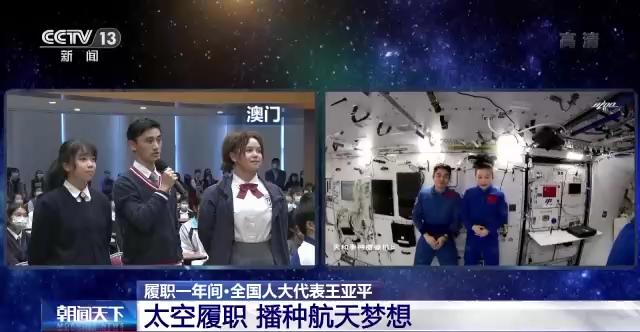 2021年12月9日,中國空間站首次太空授課活動“天宮課堂”開講。課堂上,除了和北京、廣西南寧、四川汶川的青少年展開互動,王亞平還與來自香港、澳門青年學生分享了太空的奇妙。