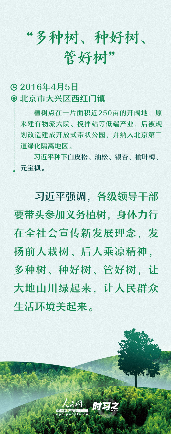 春風吐綠、草木初萌,又是一年植樹節(jié)。“造林綠化是功在當代、利在千秋的事業(yè)” “前人栽樹,后人乘涼”……黨的十八大以來,習近平總書記每年都會參加義務(wù)植樹活動,并多次談到植樹造林的重大意義。過去九年間,習近平總書記都在哪里植樹?種了哪些樹?每次植樹都講了些什么,一起來回顧。