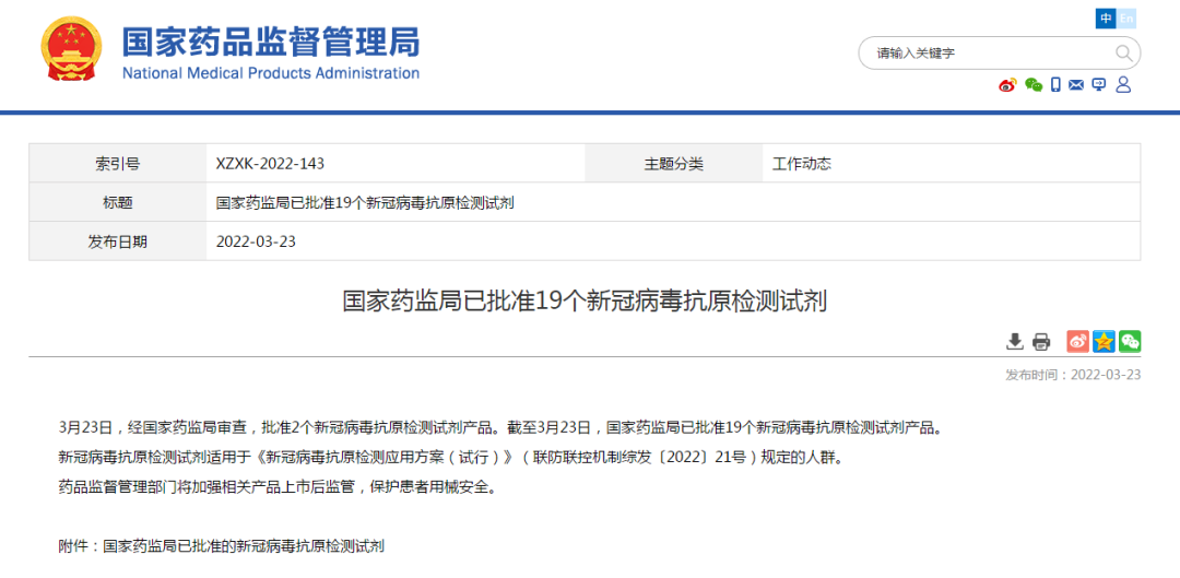 國家藥監(jiān)局已批準(zhǔn)19個新冠病毒抗原檢測試劑