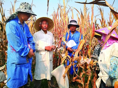 玉米育種專家程相文(左二)和科研團隊在南繁科研育種基地做研究。光明圖片