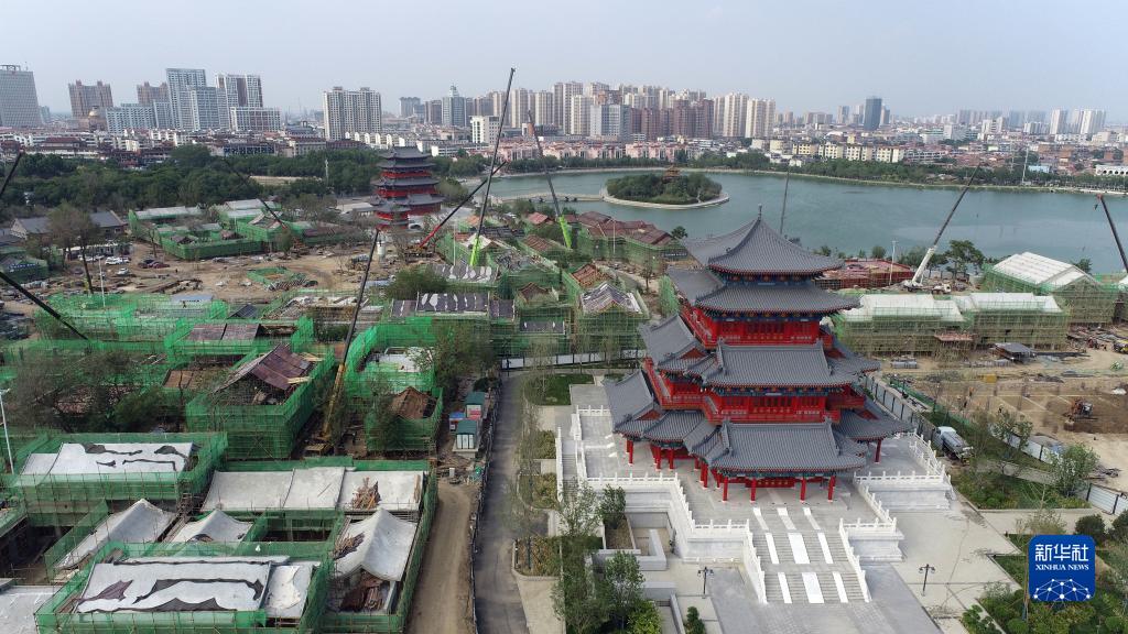 這是5月24日拍攝的河北省滄州市大運河畔正在修建的南川樓、朗吟樓(無人機照片)。新華社記者 駱學峰 攝