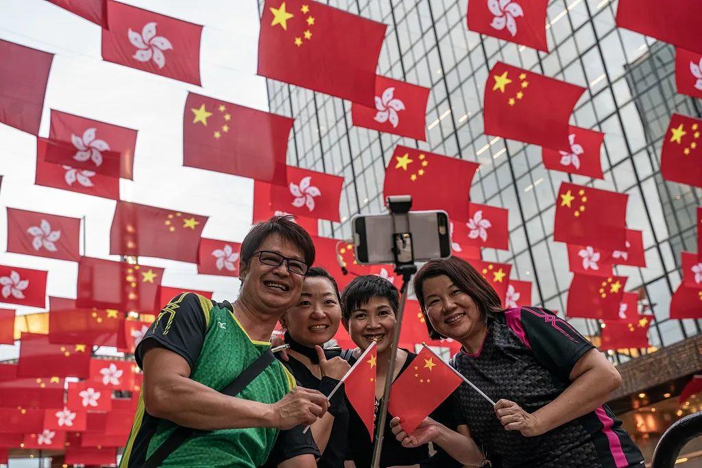 △2021年7月1日,香港市民在街頭揮舞五星紅旗,慶祝中國共產黨成立100周年及香港回歸祖國24周年。