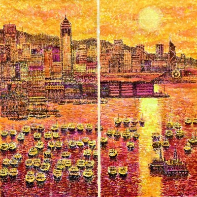我家住在海灣邊上,從窗口望出去常常就是這樣一片金色的港灣。香港從一個(gè)小漁村,發(fā)展成為國際化大都市,有很多可歌可泣的故事。我畫的港灣,有很多香港的代表性建筑,海面上有游艇、吊船,也停了小漁船。在技法上,我畫得比較粗獷,不是那種很講究的描繪。我是先把紙揉皺了以后再畫的,有很多斑斑駁駁的肌理。這種肌理效果實(shí)際上承載著一種歷史的沉淀、歷史的痕跡。色彩是金黃色的,在太陽照射下,港灣光芒萬丈,象征著美好的香港,也祝愿香港經(jīng)歷風(fēng)雨后能夠有更美好的明天。