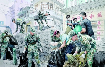 這是一幅寫實(shí)的水彩畫,站在廢墟之上的解放軍、警察和市民,或手持鐵鍬清理倒塌的磚墻,或手拿垃圾袋裝填雜物……他們互相幫助、齊心協(xié)力,專注而有愛。畫中元素飽滿而不凌亂,色彩勻稱和諧,畫中人物的動(dòng)作、姿態(tài)與表情雖然不一樣,但并沒有沖突感,反而有一種和諧的美。這是我這幅畫想要帶給觀眾的視覺感受,同時(shí)也想傳遞給人們一種不懼風(fēng)雨、齊心協(xié)力、擔(dān)當(dāng)有愛的精神。
