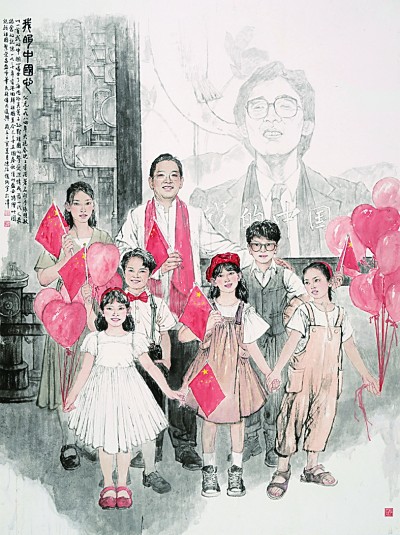 搞藝術(shù)創(chuàng)作,技術(shù)手法是基礎(chǔ),作品的思想性更為關(guān)鍵。好的作品要有思想、有感染力,創(chuàng)作者首先自己要情緒飽滿。我反復(fù)聆聽和哼唱《我的中國心》,內(nèi)心無比澎湃,我深刻地體會(huì)到作為中國人滿滿的自豪感,以及香港文藝界人士對于祖國的認(rèn)同和回歸的渴望。帶著這份熱血沸騰,擅長畫工筆畫的我第一次采用小寫意的方式,描繪了一個(gè)時(shí)空交疊的場景:香港街頭,花甲之年的張明敏帶著一群手拿五星紅旗的孩子重唱《我的中國心》;背后的大屏幕上,播放著1984年他在央視春晚演唱的畫面。