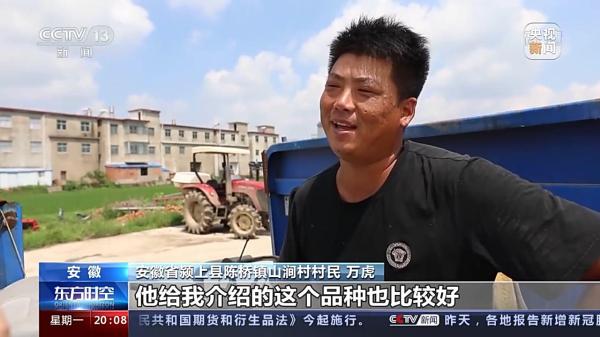 安徽潁上縣陳橋鎮山澗村村民 萬虎:今年趕個豐收年,我的收成也比較滿意,他給我介紹的這個品種也比較好。