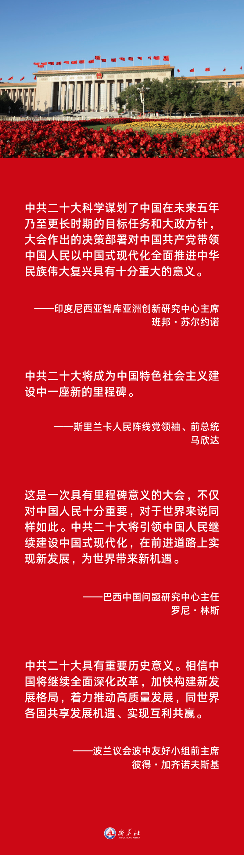 連日來(lái),中共二十大受到國(guó)際社會(huì)持續(xù)高度關(guān)注。在中共二十大勝利閉幕之際,海外人士紛紛表示,此次大會(huì)具有重要里程碑意義,不僅對(duì)中國(guó)產(chǎn)生深遠(yuǎn)影響,也為世界各國(guó)攜手應(yīng)對(duì)挑戰(zhàn)、實(shí)現(xiàn)共同發(fā)展注入動(dòng)力。相信在中國(guó)共產(chǎn)黨堅(jiān)強(qiáng)領(lǐng)導(dǎo)下,中國(guó)將不斷以新發(fā)展為世界提供新機(jī)遇,為推動(dòng)構(gòu)建人類(lèi)命運(yùn)共同體、建設(shè)更加美好世界作出新的貢獻(xiàn)。