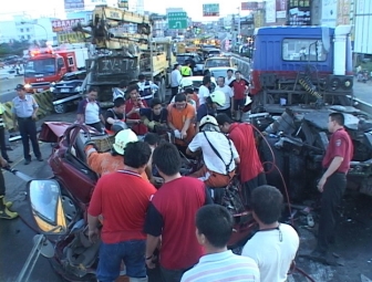 經清算,共有16部大小車輛撞成一塊,其中一輛紅色小客車受創最嚴重,遭撞擊后整輛車瞬間變成一堆廢鐵,車內4人都被卡在車內。
