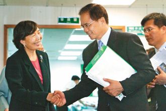 民進黨昨天舉行中常會,會中中常委一致慰留黨主席游錫堃(中),會后游錫堃向陳水扁辦公室秘書長葉菊蘭(左)等中常委致意。(臺灣《聯合報》圖片)