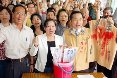 臺聯黨“立委”尹伶瑛(前排左二)與101名黨員,8日下午宣布集體退黨,抗議臺聯黨中央被“紅衫軍”占領,高呼“臺聯紅衫軍全面掃除”等口號,并將黨證丟入紅水桶。臺灣“中央社”記者葉子綱攝