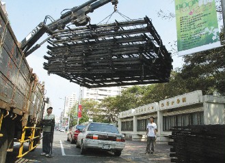 高雄市警方將“拒馬”載往法院周圍,準備架設。(聯合晚報圖)