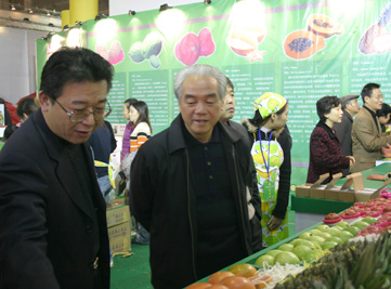 “中國湖南第七屆農(nóng)博會”上,湖南省臺辦佘友文主任(左二)到臺灣水果展區(qū)參觀。(資料圖)