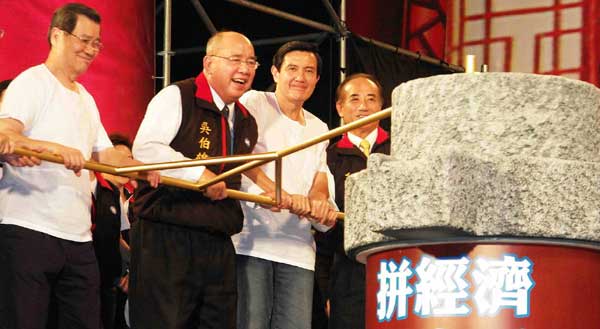 中國國民黨今天舉行113周年黨慶活動,國民黨2008年臺灣地區正副領導人選舉參選人馬英九(左三)、蕭萬長(左一),國民黨主席吳伯雄(左二),臺灣“立法院長”王金平(左四)共同推石磨,宣示“拼經濟”。來源:臺灣“中廣新聞”