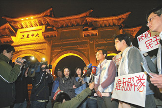臺當局“教育部”最快明天凌晨將拆掉中正紀念堂正門牌樓上的“大中至正”牌匾題字,多名第三社會黨成員自組“維和部隊”。《聯合報》記者侯世駿攝