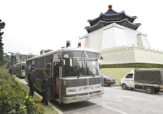 中正紀念堂廣場這幾天已集結零星的民眾,進駐的保警為免刺激民眾,目前都部署在隱密的地方。(高大林)