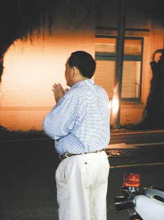 基隆巿小學(xué)四年級女童曹博涵疑上吊,其祖父在醫(yī)院急診室外對天祈求神明保佑。可惜醫(yī)院回天乏術(shù)。(臺灣《聯(lián)合報》圖片)