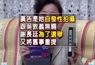 近日,為了拼“立委”選舉,謝長廷再次提及此事,試圖抹黑國民黨。昨天,當事人白冰冰接受媒體訪問時表示不愿再談此事。她重申,廣告是她自發性拍攝,跟吳敦義無關,謝長廷為了選舉,又將舊事重提,只會讓她不齒,她不想隨之起舞,幫謝長廷炒作。