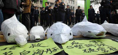 臺(tái)灣環(huán)保團(tuán)體9日帶著紙糊的白海豚,在臺(tái)當(dāng)局“行政院”大門外抗議陳情,呼吁擬定白海豚保護(hù)計(jì)劃及行動(dòng)綱領(lǐng)。臺(tái)灣“中央社”記者王飛華攝
