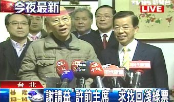 中國臺灣網1月17日消息 據臺灣TVBS報道,民進黨“立委”選舉大敗,為了“災后重建”,接任黨主席的謝長廷今天拜會前主席許信良,爭取支持。