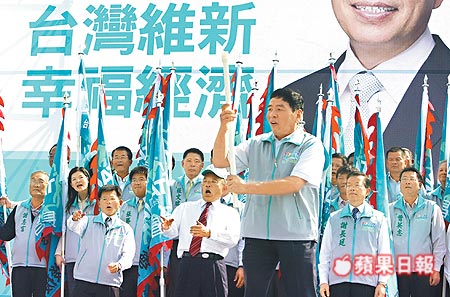 旗桿太長,差點打到謝長廷(右三)。(蘋果日報圖)