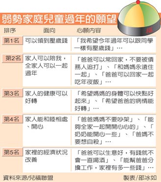 兒盟今天發表“經濟弱勢家庭年節生活情形調查報告”,針對該會服務的535個弱勢家庭和994名兒童調查發現,94%的弱勢家庭家長,年節期間壓力倍增,64%甚至覺得過年壓力很大。主要壓力來源都跟經濟有關,包括84%擔心沒錢過年,50%家長更因平常只是打零工、領日薪,擔心春節假期無工可打,完全失去收入來源。