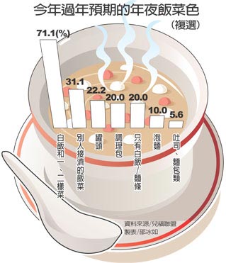 弱勢家庭也大多沒有象樣的年夜飯。兒盟調查發現,81%的弱勢家庭沒錢辦年貨,64%的家庭不敢向親友拜年。當很多人擔心過年吃太好而暴肥時,卻有72%的弱勢家庭今年沒有豐盛的年夜飯可吃,兩成左右只能靠罐頭、調理包、泡面、吐司等果腹,甚至三成左右要靠別人接濟才有飯菜吃。