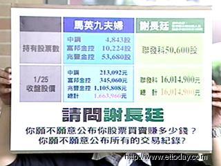 四問謝長廷股票。謝長廷質疑馬英九的股票買賣,馬英九在第一時間已公布他的股票持有情形,現在換謝長廷,請他清楚交待股票交易紀錄,聯發科買賣的動機、價額,并請他保證自己和家人從來沒有買過聯發科以外的股票。(趙靜)