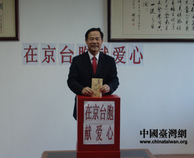 2月3日下午,北京市臺(tái)資企業(yè)協(xié)會(huì)發(fā)起“在京臺(tái)胞為災(zāi)區(qū)獻(xiàn)愛(ài)心募捐活動(dòng)”,林清發(fā)率北京臺(tái)協(xié)十二位副會(huì)長(zhǎng)、理事等人參與。圖為北京市臺(tái)資企業(yè)協(xié)會(huì)會(huì)長(zhǎng)林清發(fā)正在捐款。(攝影:田云鵬)
