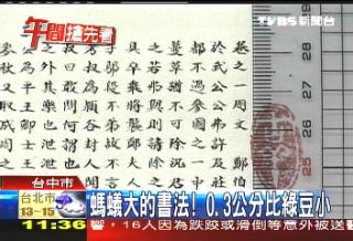 中國臺灣網(wǎng)2月5日消息 據(jù)臺媒報道,臺中市一位53歲的書法家,因為專寫一種比綠豆還小的毛筆迷你字體而引人關(guān)注。他的最新作品臨摹了《古文觀止》,多達(dá)11萬6千字,每個字的長寬只有0.3公分,沒有放大鏡的幫助根本看不清楚。