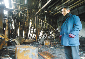 火熄了,云門舞集總監林懷民走進燒塌了的排練場,看著化為灰燼的心血沉思。(聯合報圖)