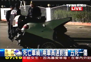 據(jù)臺灣“中廣新聞”報(bào)道,臺北縣警方調(diào)查指出,凌晨2點(diǎn)左右,在云林縣云145線北港路段,兩部分別南下北上的小客車,不知何故,發(fā)生對撞,造成這起5死1重傷的重大車禍。
