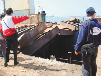 “朝國6號”昨天進行甲板焊切工程時發(fā)生氣爆,甲板被炸開一個大洞,造成2名工人死亡,警方在現(xiàn)場勘驗。(臺灣《聯(lián)合報》記者包希勝攝 )