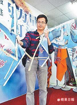 馬英九競選總部人員出示遭人折斷的競選旗幟。(蘋果日報圖)