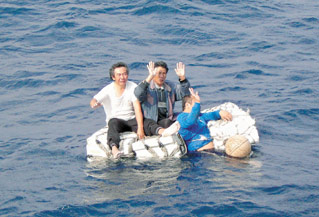 三名船員坐在浮墊上在海上漂流11小時,船長徐東誠(右)為了穩住浮墊,半身浸在海水中。(聯合晚報圖)
