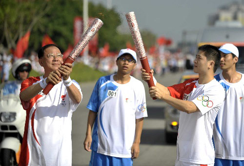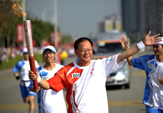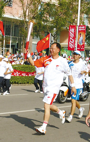 5月9日,北京奧運圣火傳遞活動在惠州舉行,臺商奧運火炬手楊平和手持火炬傳遞。新華社記者劉大偉攝