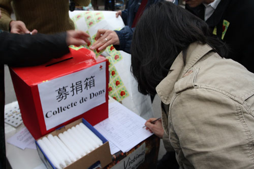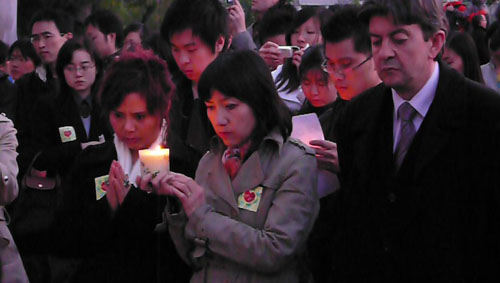 法國友人與法國華人華僑和留學生一起為四川大地震遇難者進行祈禱。圖中為法國前總統希拉克的養