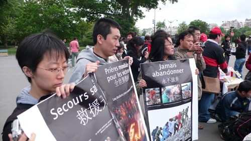 巴黎當地時間5月18日晚上,法國華人華僑留學生在埃菲爾鐵塔下舉著海報,向游客展示發生在中國的地震災難和救援進展。