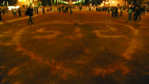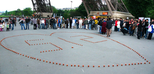 埃菲爾鐵塔下擺好的祈福蠟燭圖案。當天,法國巴黎舉行了千人參加的燭光祈福活動,向四川大地震受害者表達哀思。