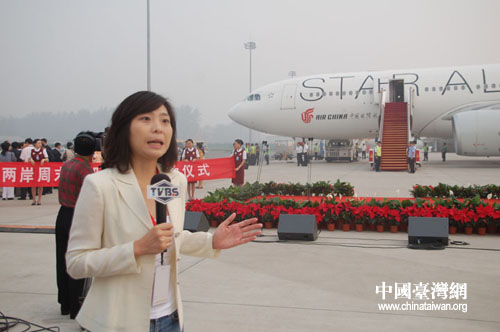 臺(tái)灣TVBS記者進(jìn)行現(xiàn)場(chǎng)報(bào)道(攝影:鐘寶華)