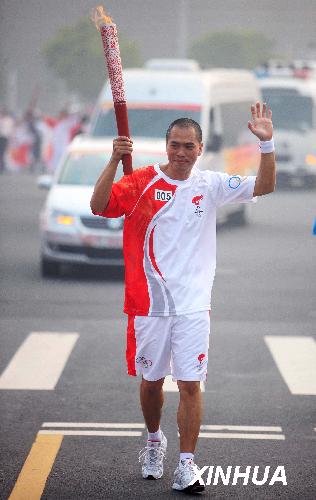 7月25日,臺商火炬手王尚卿手持火炬傳遞。新華社圖 記者邢廣利攝