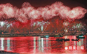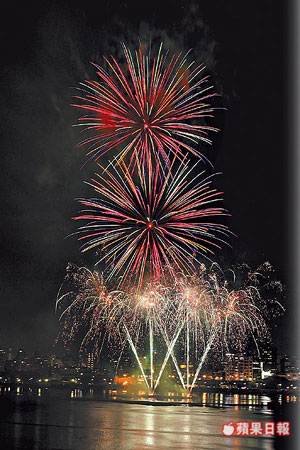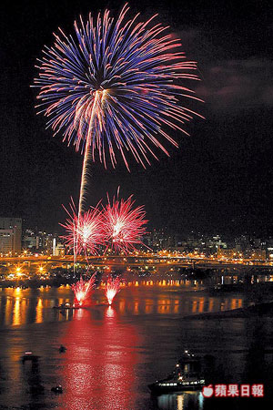 據(jù)臺(tái)灣媒體報(bào)道,昨晚8時(shí)30分淡水河畔先以電影《泰坦尼克號(hào)》配樂(lè)開(kāi)場(chǎng),連接臺(tái)北縣市的忠孝橋隨即噴出800米煙火瀑布。4艘平臺(tái)船接著從河面上發(fā)射七彩花朵、愛(ài)心、游龍、獅子頭等高空煙火圖案,其中包括號(hào)稱歷來(lái)最大的10英寸高空煙火,射程可離地300米,開(kāi)花直徑200米,另搭配多款低空煙火。