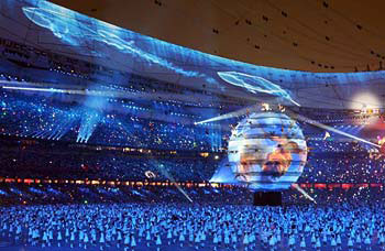 北京奧運(yùn)開(kāi)幕典禮表演節(jié)目展現(xiàn)“同一個(gè)世界,同一個(gè)夢(mèng)想”的主題。臺(tái)灣《中國(guó)時(shí)報(bào)》圖