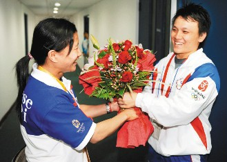 盧映锜(右)為中華臺北隊拿下第二面銅牌后,拿下第一面獎牌的隊友陳葦綾(左)送花祝賀。