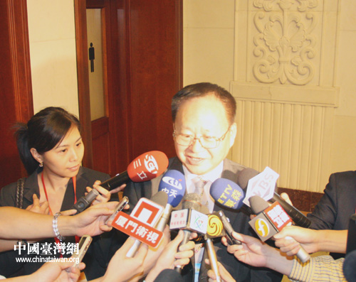 2008年臺(tái)商座談會(huì)28日上午在北京人民大會(huì)堂舉行。國(guó)務(wù)院副總理王岐山和國(guó)務(wù)院20多個(gè)主要部門(mén)負(fù)責(zé)人及60多位臺(tái)灣工商界人士、大陸臺(tái)商代表參加座談。圖為全國(guó)臺(tái)灣同胞投資企業(yè)聯(lián)誼會(huì)會(huì)長(zhǎng)張漢文在會(huì)場(chǎng)外接受媒體采訪。(中國(guó)臺(tái)灣網(wǎng) 田云鵬 攝)