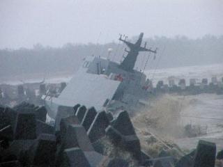 據(jù)報道,歷經(jīng)薔薇臺風后,擱淺的導彈快艇已被潮水沖上消波塊,船身也因撞擊消波塊而造成許多破洞。由于昨天海上的風浪仍大,臺海軍將等風浪變小后再進行拖吊作業(yè),如果拖吊不順利,不排除全部拆解后,運回左營軍港重新組裝。